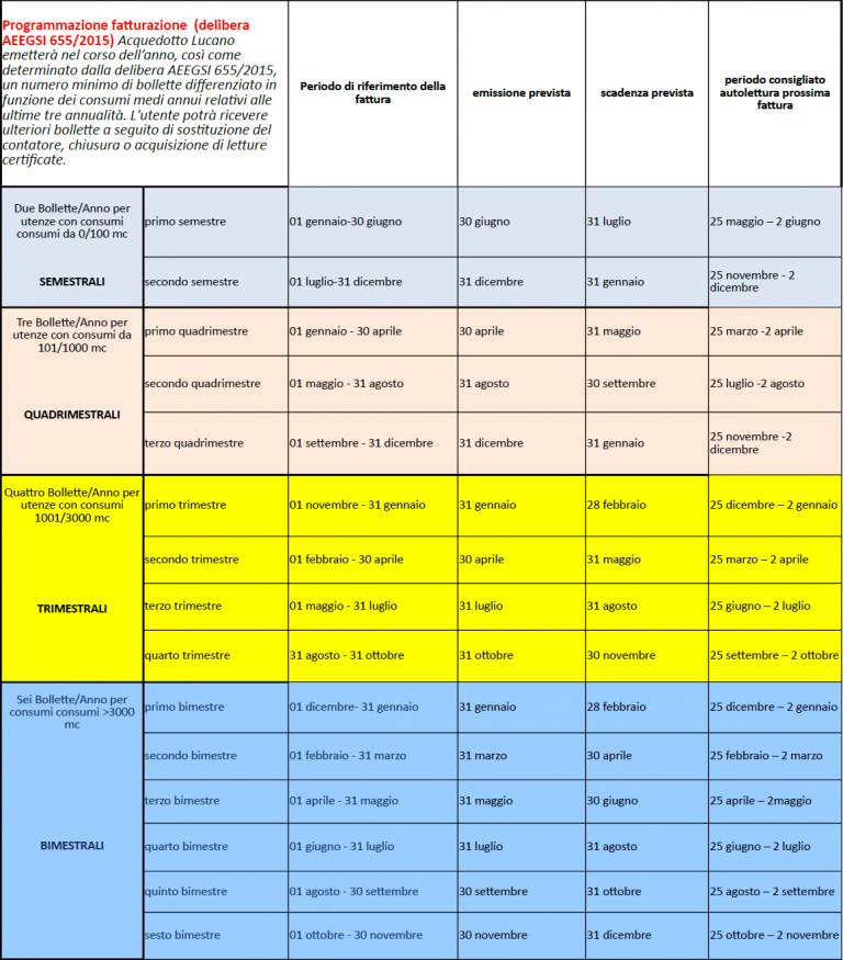 Acquedotto Lucano emette le bollette con la periodicità prevista dall’Autorità di Regolazione Energia Reti e Ambiente (Arera) n. 665 del 2017, che varia sulla base dei consumi medi annui dell’utente negli ultimi tre anni: